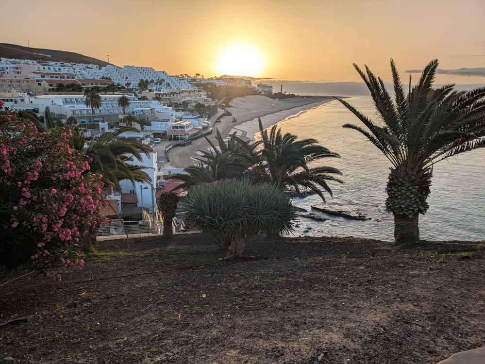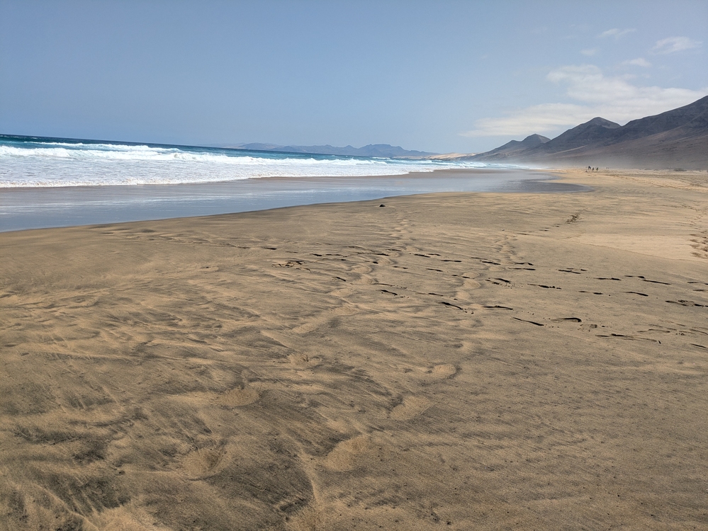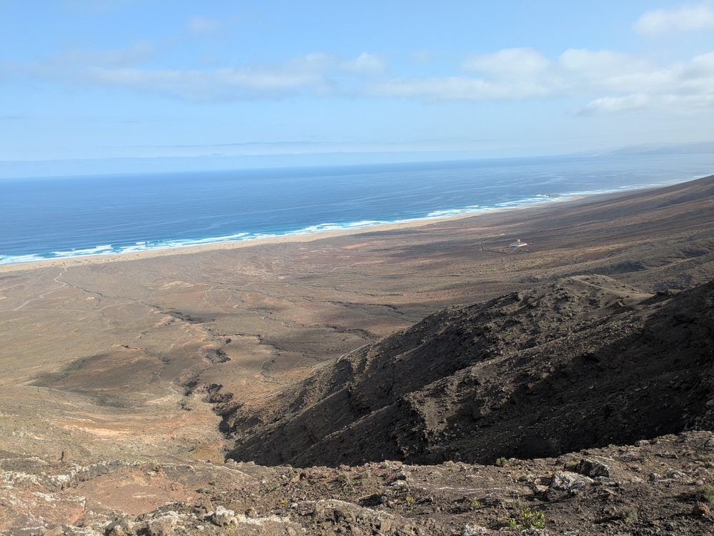 Um 10:00 ist der Pass nach rund 9,5 km überschritten und ich werde mit einer sagenhafte Aussicht auf Casa Winter, Cofete, den Strand und das Meer belohnt.