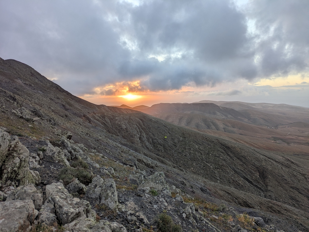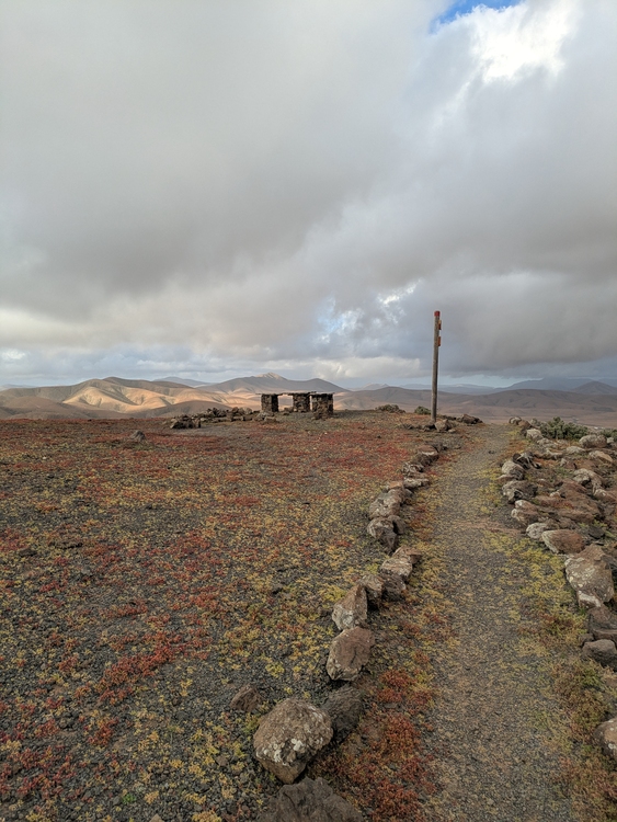 Anschließend wieder 4,5 Liter Wasser aufgeladen und es ging dem Gr131 folgend entlang von Straßen und Pisten. Die Schlenker hinauf und hinab ersparte ich mir zumeist und blieb einfach auf der Straße. Irgendwann geht es dann in einen single Trail Richtung Cardon. Der Wind hat ordentlich aufgedreht, wie man auch gut an den fünf Windrädern sehen kann. Kurz kommen ein paar Tropen vom Himmel und kaum hab ich die Regenjacke an, so hört es auch schon wieder auf.