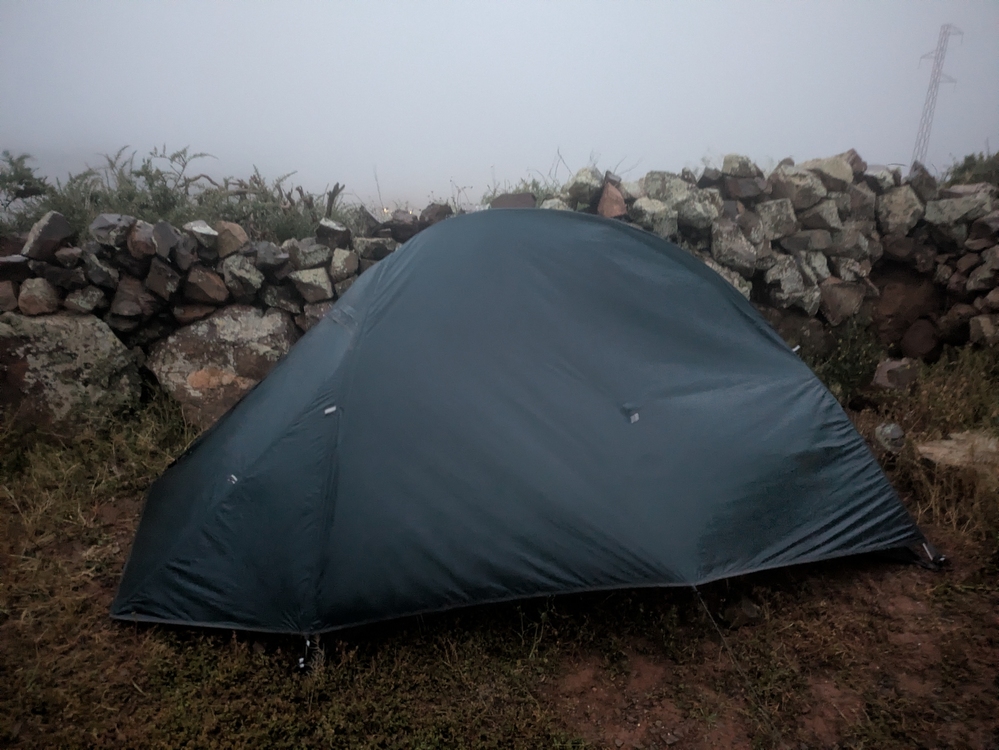 Beim Zeltaufbau hatte ich den Platz für die Apsis verplant und der notdürftige Behelf mittels Steinen funktionierte nur bedingt. So wurde das immer wieder vom Wind aufgeblasen oder gegen Innenzelt gedrückt. Auch sonst zerte und drückte der Wind unermüdlich am Zelt. Das sorgte dann wieder für eine Nacht ohne längere Schlafphasen.