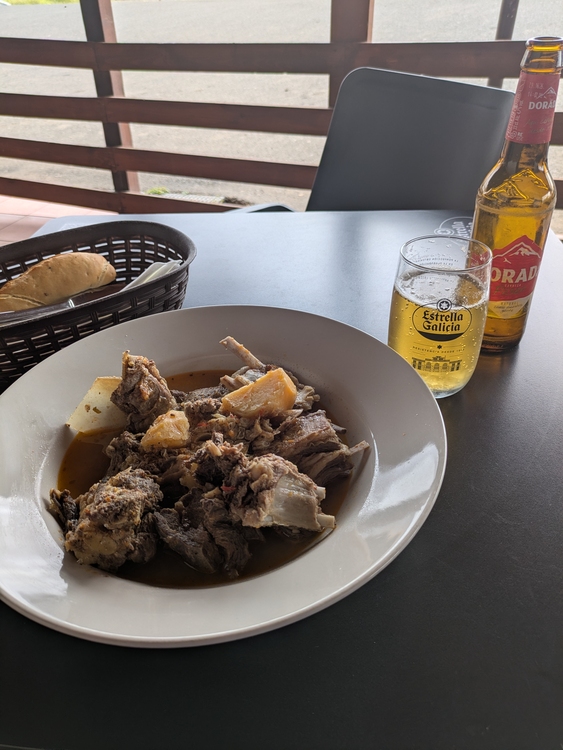 Ich entscheide mich für die Carne de Cabra und eine Flasche Bier. Wie schon bei dem Café von gestern hängen hier diverse "locals" rum. Immer Mal wieder stößt jemand dazu und ein anderer fährt von dannen. Die Getränkepreise sind wie schon im Café spottbillig. Fast alles für 1-2€.