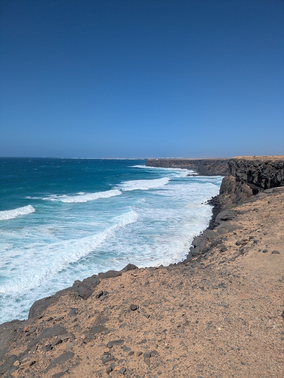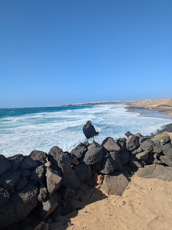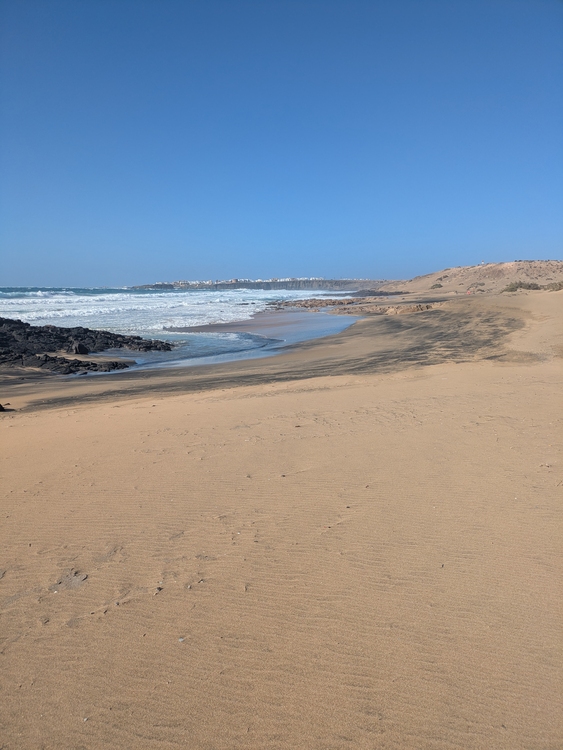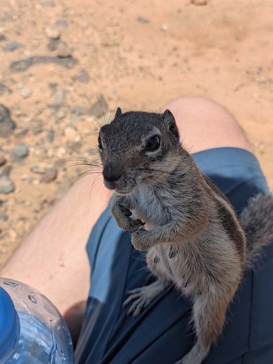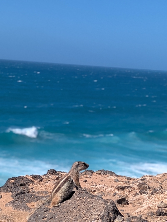 Unverhofft kommt ein Atlashörnchen zu mir. Die sind schon so zutraulich, dass der mir nichts dir nichts aufs Bein klettert. Da es hier aktuell ja nicht besonders trocken ist gehe ich nicht davon aus daß es ans Wasser möchte, sondern es auf andere Leckereien abgesehen hat. So knuffig es auch dreinschaut, ich bleibe hart! Kurz noch für die Kamera in Pose geworfen und da verschwindet es erstmal wieder. Ich genieße die Wellen und die Ruhe. Obwohl inzwischen doch recht nah an El Cotillio, ist es tatsächlich fast komplett menschenleer. Das Atlashörnchen düst dann noch einmal unter meinen Beinen durch und verabschiedet sich kurz darauf die Klippen hinunter.