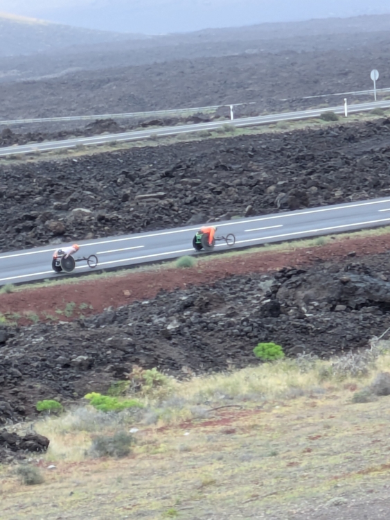 Auf der Straße sind nicht nur normale Radler unterwegs sondern auch Rollstuhlfahrradfahrer,