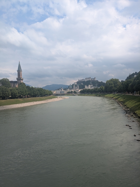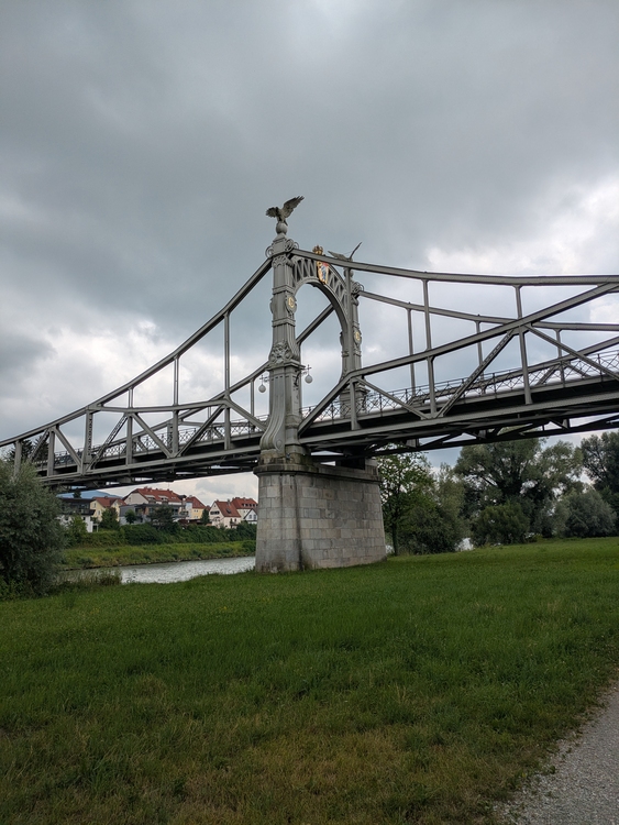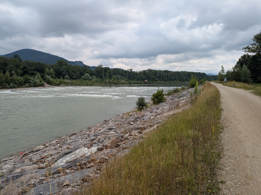 Der Weg zur Wallfahrtskirche Maria Bühel ist mir irgendwie doch zu mühsam und so geht es am deutschen Ufer die Salzach hinab. Richtig netter Weg und fast keine Menschenseele unterwegs. Nur ein kleiner Schauer trübt das Vergnügen, nachdem ich mich schon voller Optimismus eingecremt hatte als die Sonne durchgebrochen war.