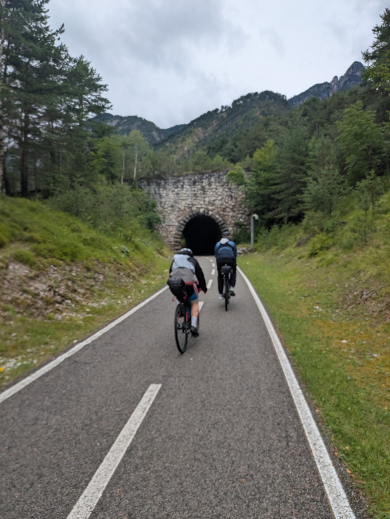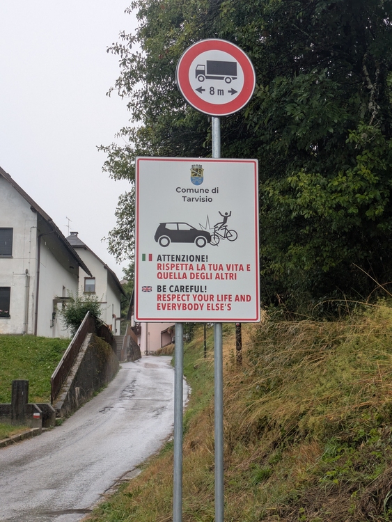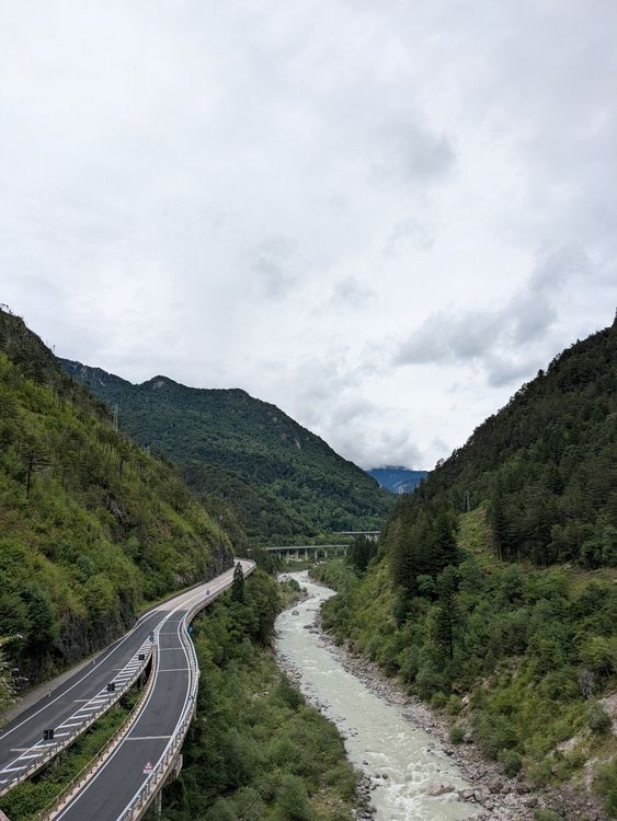 Da ich nicht so Recht daran glaube, dass es durchgehend besser wird werfe ich die Regensachen an und mache mich im leichten Regen auf Richtung Italien. Ohne Gepäck erstmal wieder umgewöhnen.
