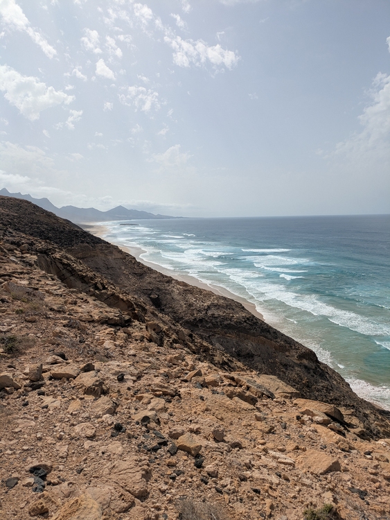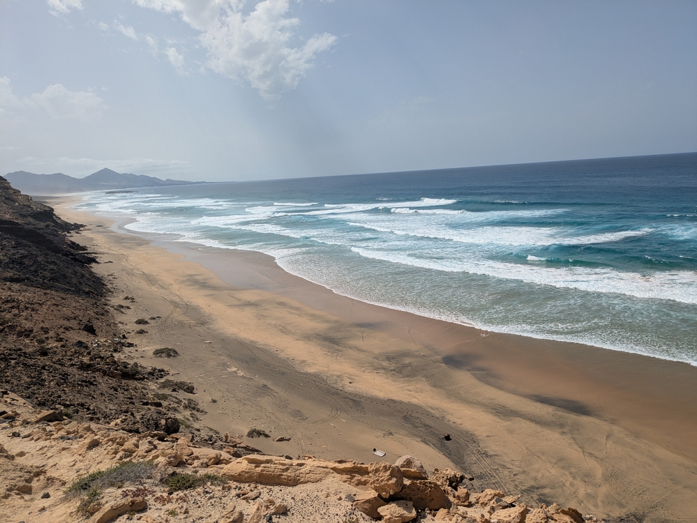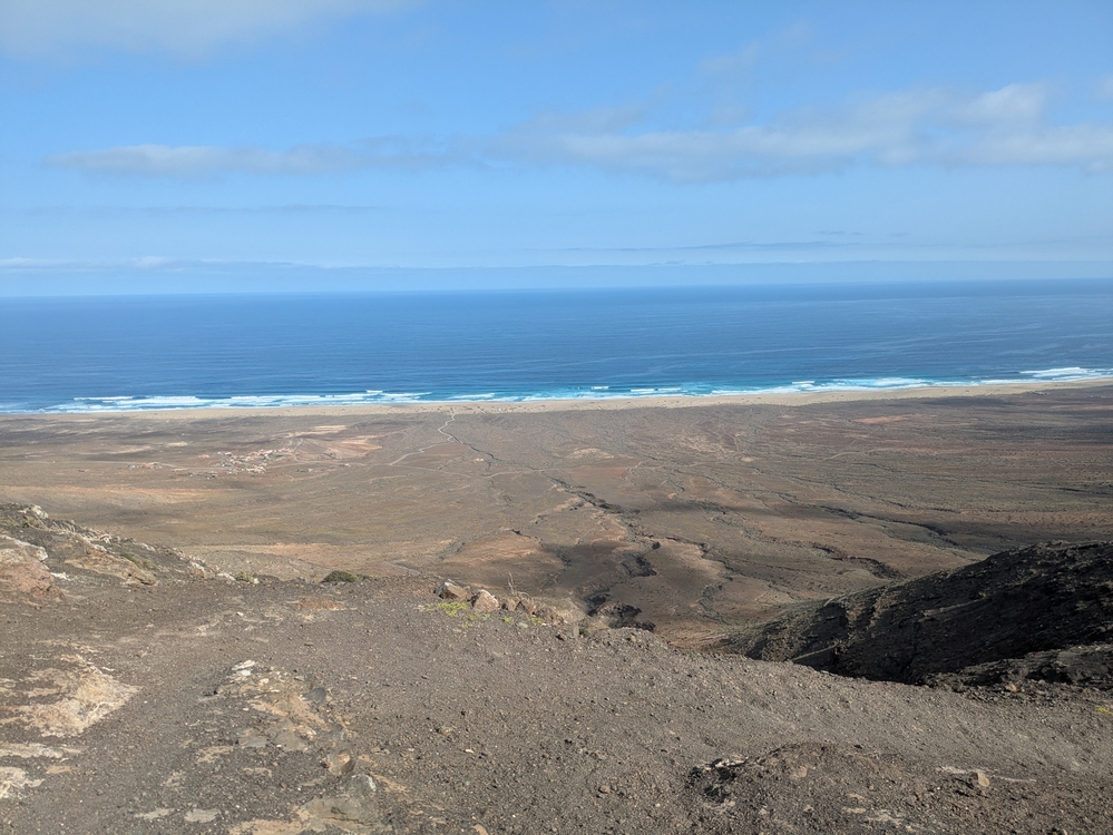 Um 10:00 ist der Pass nach rund 9,5 km überschritten und ich werde mit einer sagenhafte Aussicht auf Casa Winter, Cofete, den Strand und das Meer belohnt.