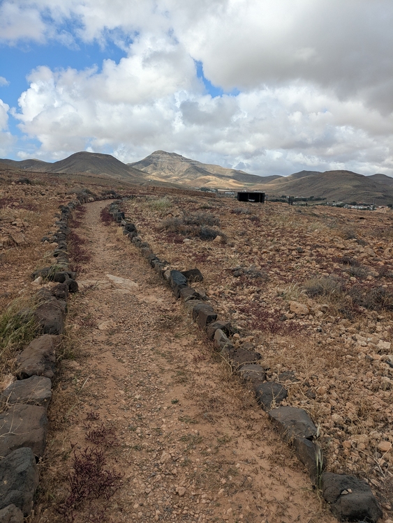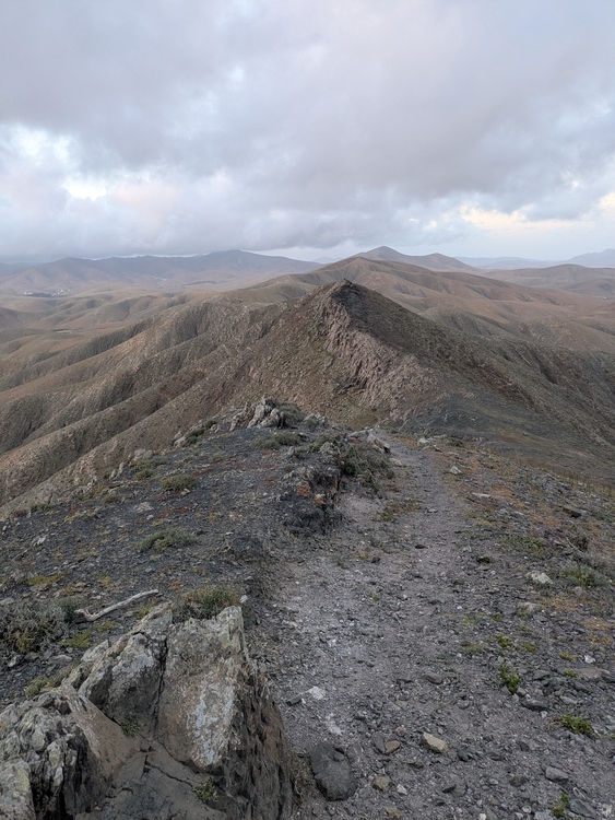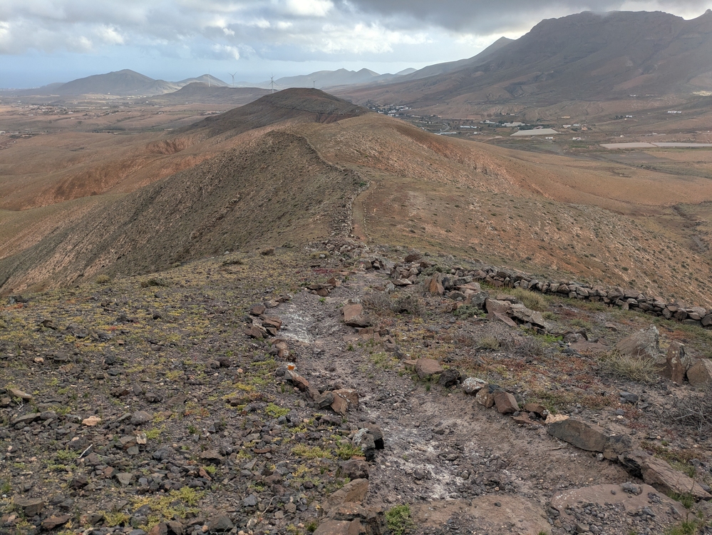 Anschließend wieder 4,5 Liter Wasser aufgeladen und es ging dem Gr131 folgend entlang von Straßen und Pisten. Die Schlenker hinauf und hinab ersparte ich mir zumeist und blieb einfach auf der Straße. Irgendwann geht es dann in einen single Trail Richtung Cardon. Der Wind hat ordentlich aufgedreht, wie man auch gut an den fünf Windrädern sehen kann. Kurz kommen ein paar Tropen vom Himmel und kaum hab ich die Regenjacke an, so hört es auch schon wieder auf.