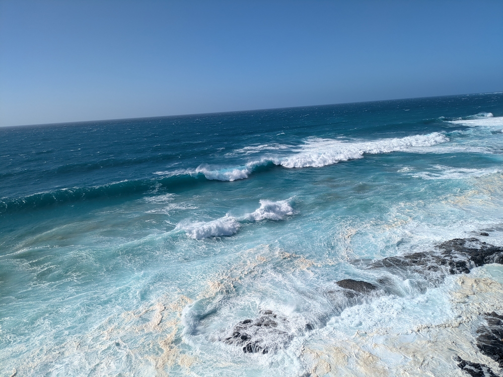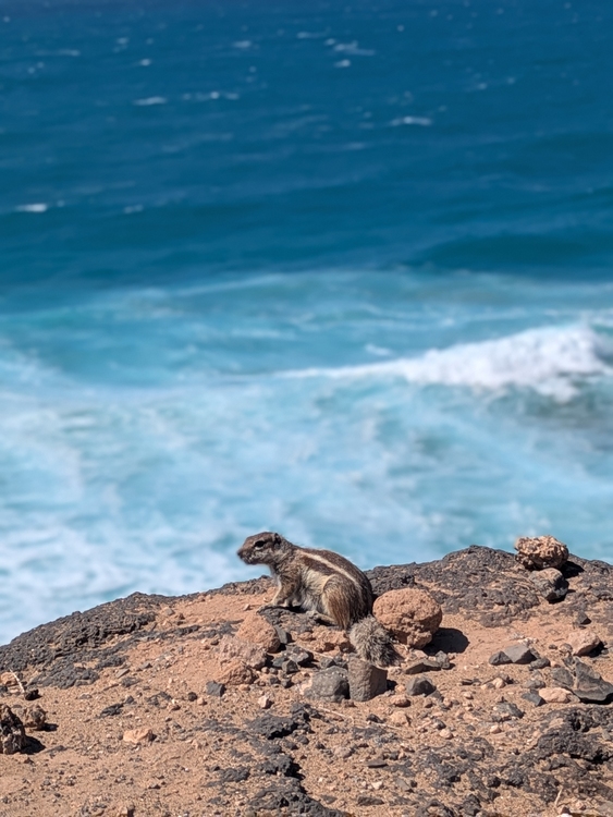 Unverhofft kommt ein Atlashörnchen zu mir. Die sind schon so zutraulich, dass der mir nichts dir nichts aufs Bein klettert. Da es hier aktuell ja nicht besonders trocken ist gehe ich nicht davon aus daß es ans Wasser möchte, sondern es auf andere Leckereien abgesehen hat. So knuffig es auch dreinschaut, ich bleibe hart! Kurz noch für die Kamera in Pose geworfen und da verschwindet es erstmal wieder. Ich genieße die Wellen und die Ruhe. Obwohl inzwischen doch recht nah an El Cotillio, ist es tatsächlich fast komplett menschenleer. Das Atlashörnchen düst dann noch einmal unter meinen Beinen durch und verabschiedet sich kurz darauf die Klippen hinunter.