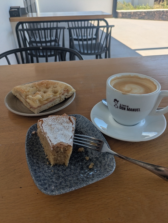 Es gibt Focaccia, Café con leche grande und Tarta Santiago