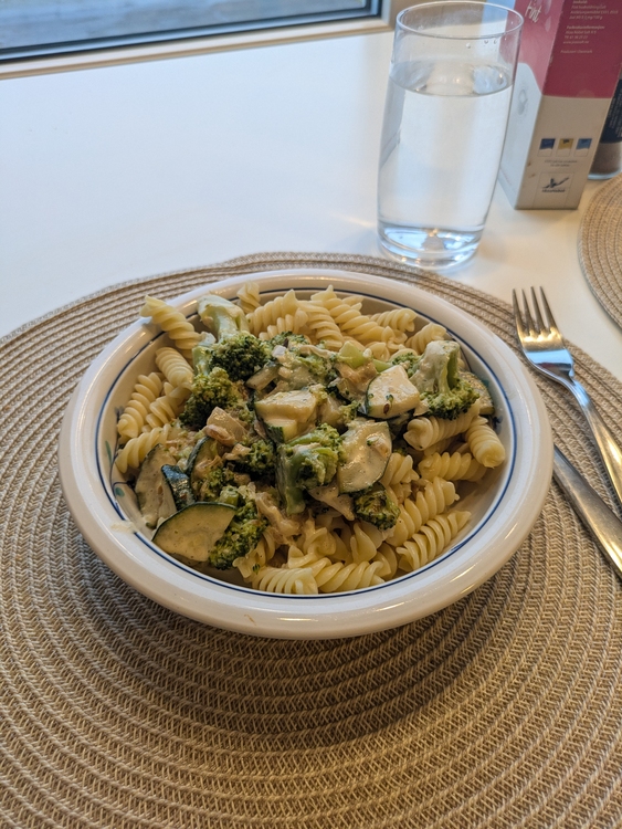 Schnell noch unter die Dusche mit fancy LED Duschkopf gesprungen und dann gibt es lecker Pasta mit Käsesauce, Brokkoli und Zucchini.